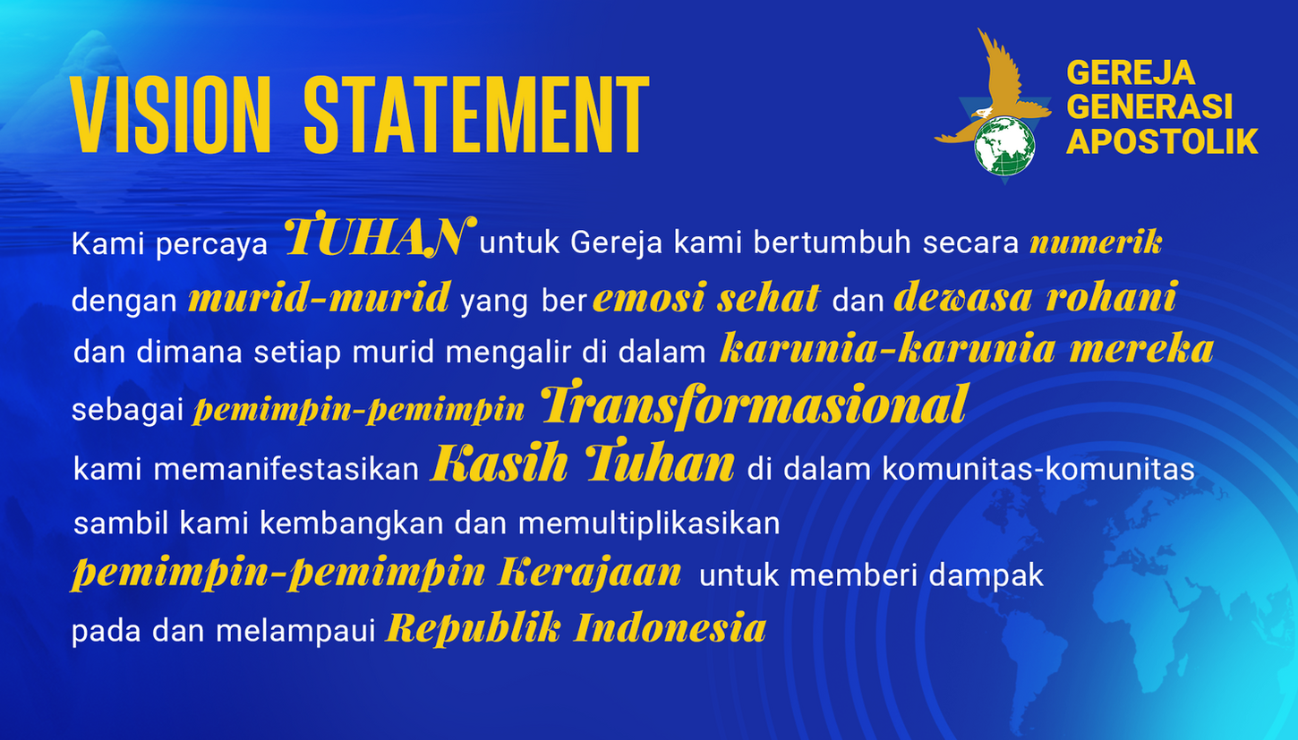 Kami percaya bahwa setiap pengikut Kristus ( Markus 1:17) adalah anak Allah yang ber misi hidup bersama Allah setiap hari (Yoh 15:5) untuk ditransformasi menjadi serupa gambar dan rupa Allah (Roma 8:29) dipimpin Roh Kudus untuk melakukan apa yang Yesus lakukan bahkan lebih besar (Yoh 14:12) sebagai Duta Besar Kerajaan Allah di bumi seperti di sorga demi orang lain (2 Kor 5:20). Basis dari pengembangan murid Kristus yang sehat emosi dan dewasa rohani adalah Kedua Hukum Allah (Matius 22:37-39).
